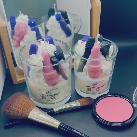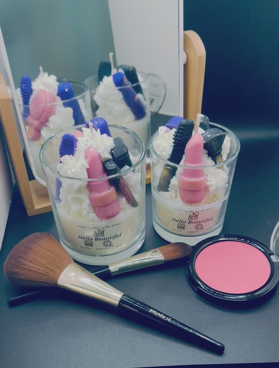 Zeg hallo tegen zelfliefde met de Hello Beautiful geurkaars. Handgemaakt, vegan en versierd met mini lipsticks, kwastjes en beautyblenders van wax. Deze kaars fluistert zachtjes: jij bent mooi, precies zoals je bent. Perfect voor in de salon, make-up lovers of als liefdevol cadeau om voor iemand die extra shine kan gebruiken.